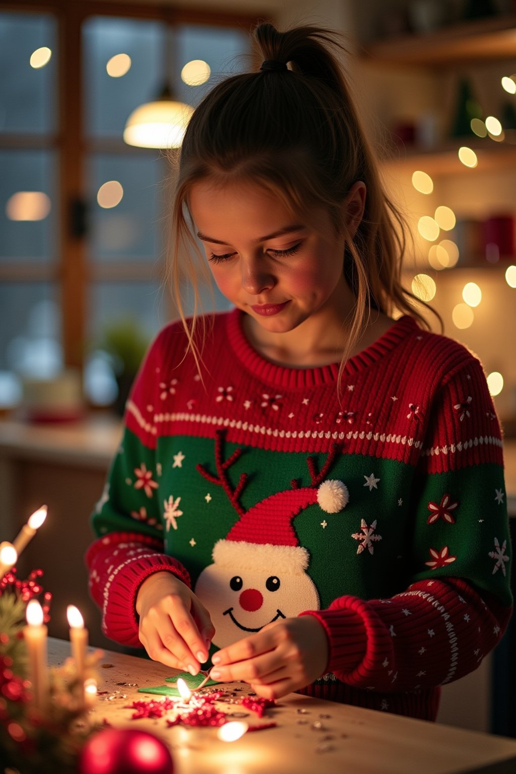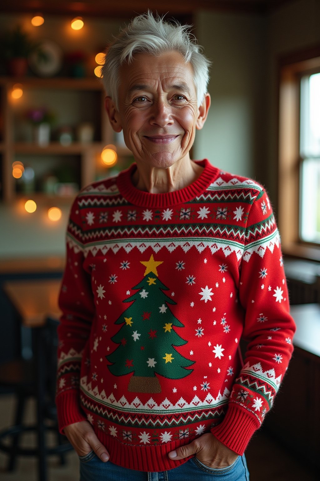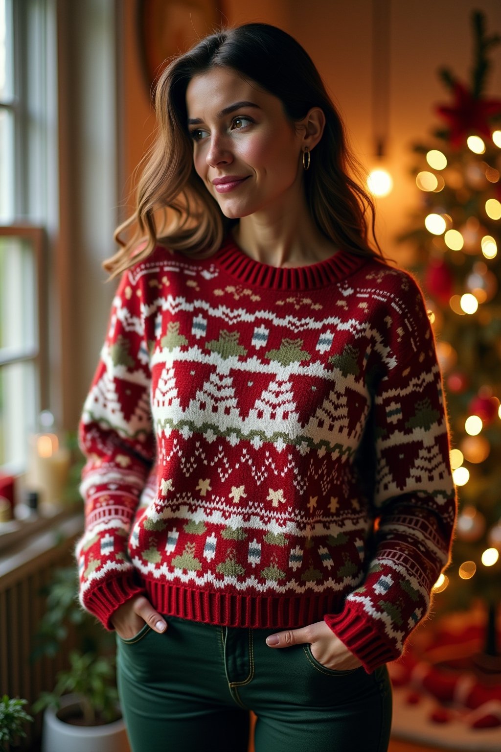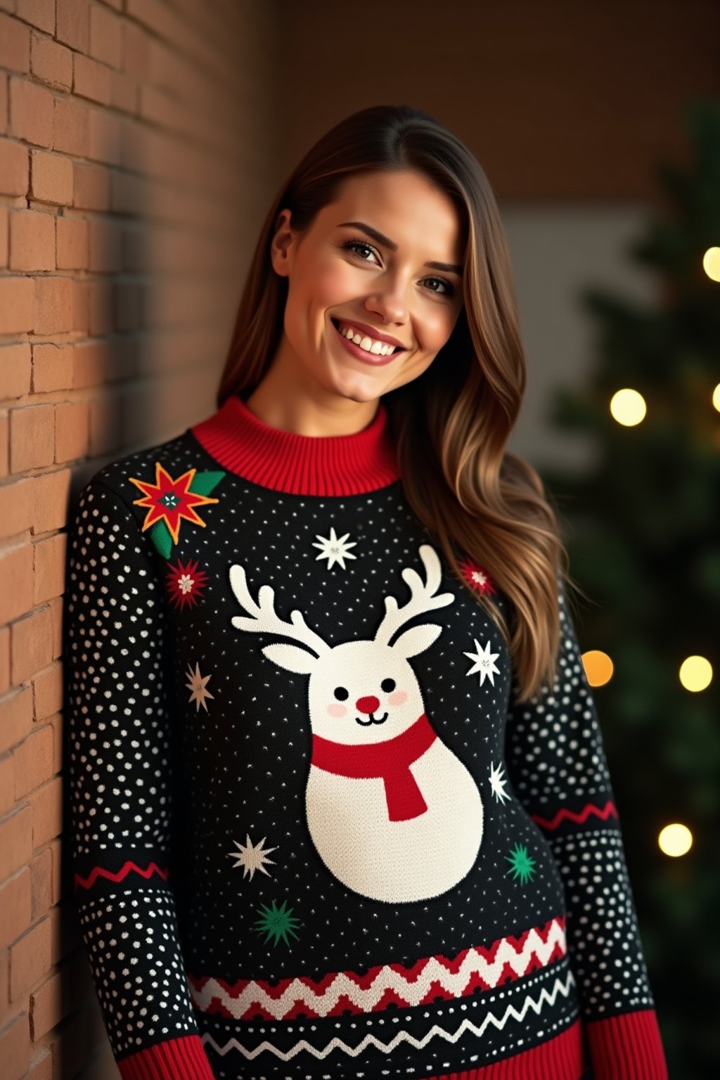Dein knalliger Weihnachtspullover wird zum echten Hingucker, wenn du ihn mit schlichten Basics wie einer schwarzen Skinny Jeans oder einem eleganten Bleistiftrock kombinierst. Für einen lässigen Look kannst du deinen festlichen Sweater mit einer coolen Lederjacke und weißen Sneakern stylen, was den Kontrast zwischen verspielt und cool perfekt ausbalanciert. Möchtest du es etwas schicker haben, trage deinen Weihnachtspullover zu einem Cordrock und ergänze das Outfit mit hohen Stiefeln und dezenten Accessoires wie feinen Goldkettchen. Bei all dem weihnachtlichen Trubel gilt die goldene Regel: Lass den Pullover mit seinen blinkenden Lichtern, Glöckchen oder dem 3D-Rentiergeweih immer der Star deines Outfits sein und halte den Rest eher zurückhaltend.