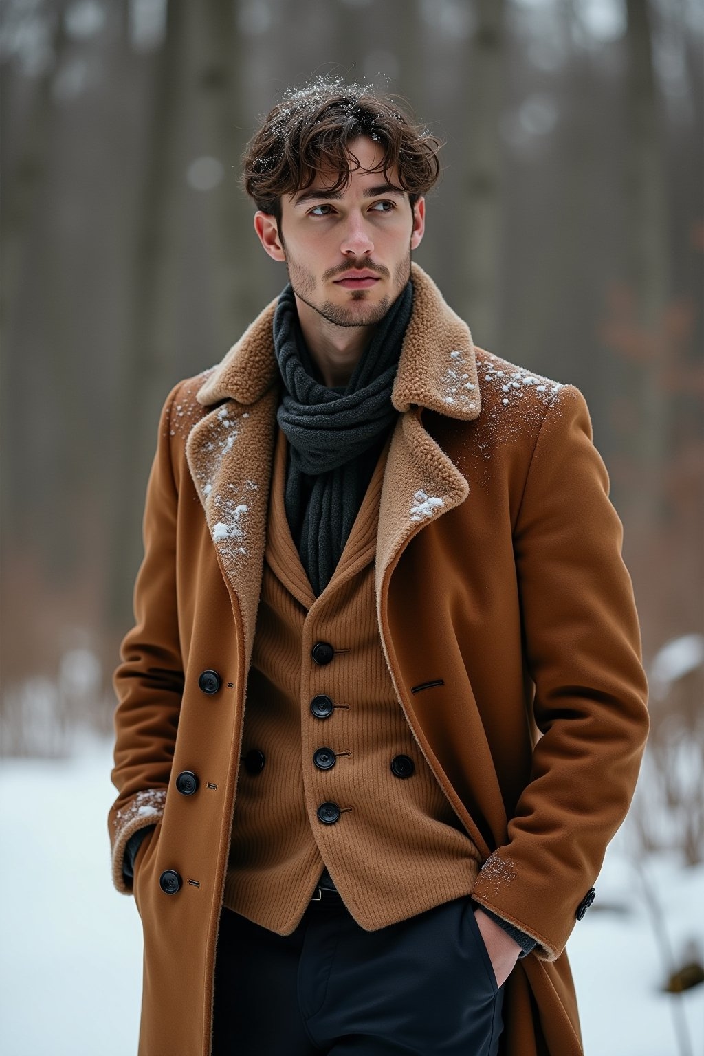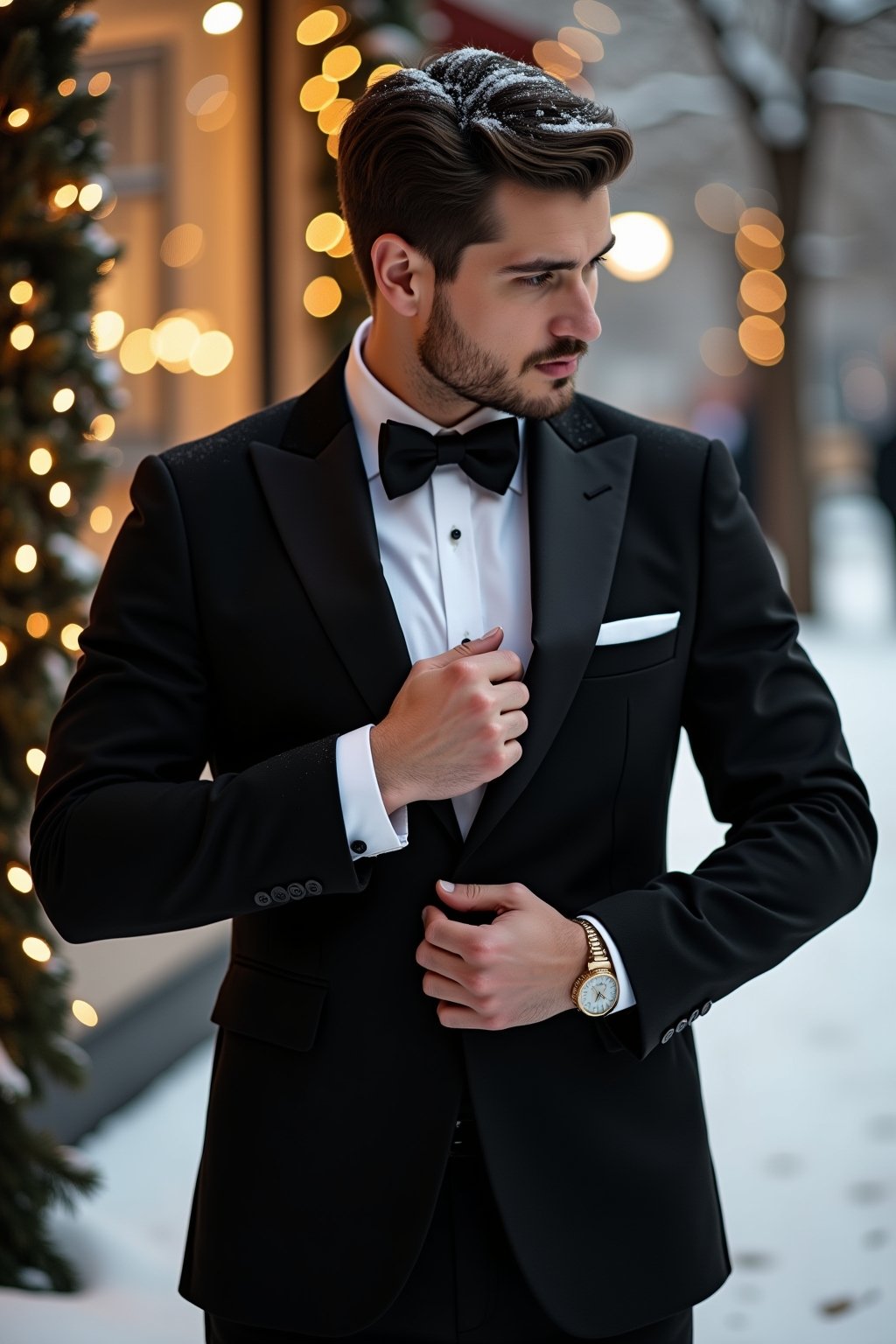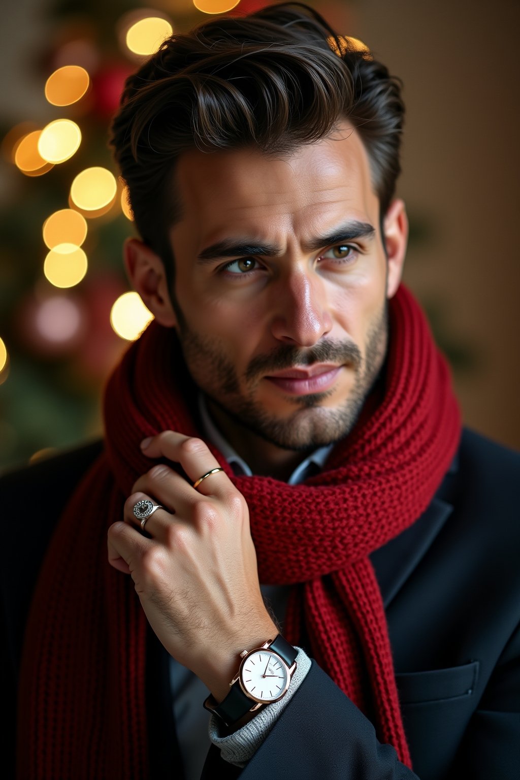 Durchdachte Accessoires können ein festtägliches Herrenoutfit entscheidend aufwerten. Eine klassische Uhr mit Lederarmband oder eine elegante Taschenuhr verleiht dem Look zeitlose Eleganz. Einstecktücher in Rot, Grün oder mit subtilen Wintermotiven setzen stilvolle Akzente im Sakko. Krawattennadeln oder Manschettenknöpfe mit saisonaler Thematik – etwa Schneeflocken oder Tannenzapfen – fügen sich dezent ein. Hochwertige Schals aus Kaschmir oder Merinowolle in dunklem Grün oder Burgunderrot bieten sowohl Wärme als auch stilistische Raffinesse. Eine Anstecknadel am Revers oder eine festliche Krawatte runden das Ensemble ab. Bei Socken darf es etwas mutiger zugehen – winterliche Muster oder Farben können unter der Hose hervorblitzen und dem Look eine persönliche Note verleihen.
