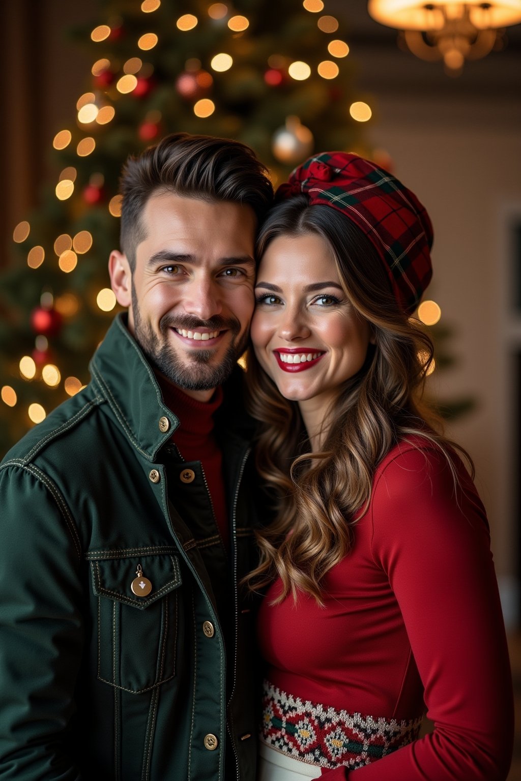 - Farblich abgestimmte Outfits in klassischen Weihnachtsfarben schaffen eine harmonische Paaroptik